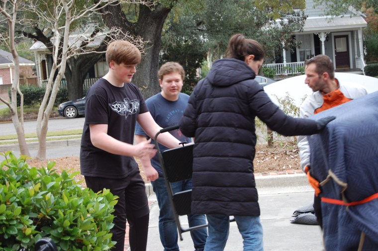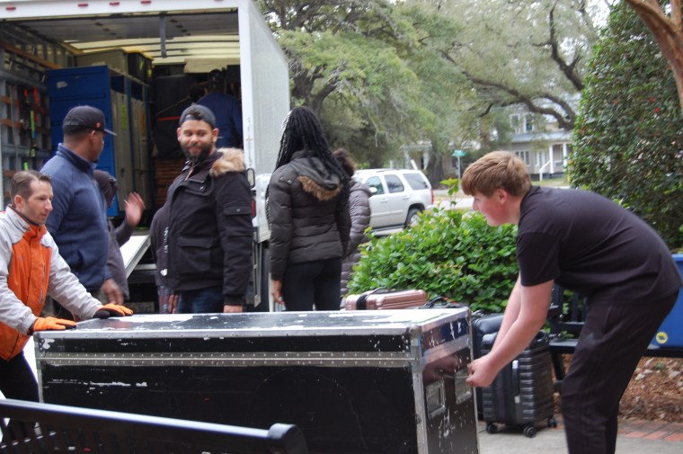 They arrived in two vans and a 24-foot moving van around 4:15 on the afternoon of January 29. The American Shakespeare Center’s previous performance was in Durham, NC, so they had had about a five-hour journey. Dr. Gates, T. J., Rebecca, and Ethan were at the ready when the van pulled up to the side of the Winyah Auditorium and actors got out and released the ramp.
