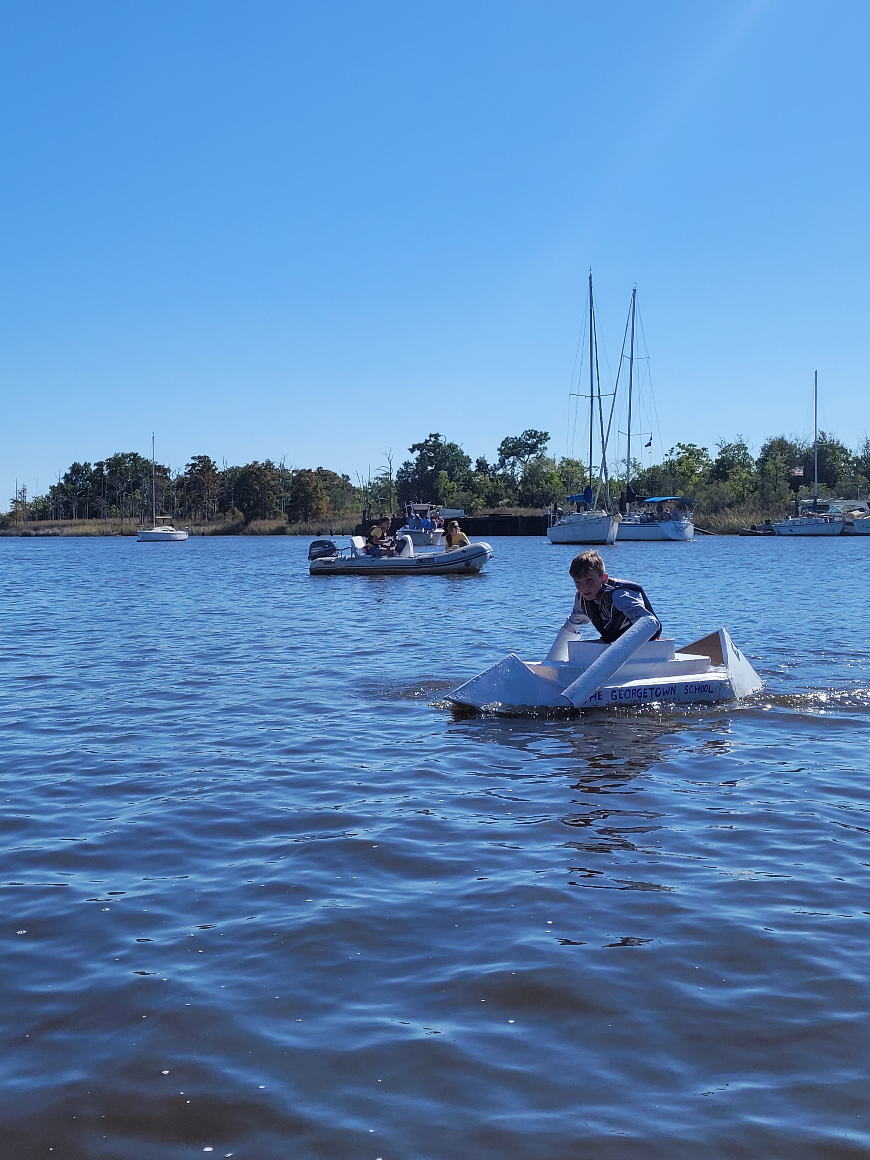 Meanwhile, Mr. Patrick’s Physics class and Mrs. Crosby’s Robotics Team joined forces to enter the Corrugated Boat Challenge on Sunday afternoon. They spent all week designing, building, and decorating the Kingfisher and the Egg of the Kingfisher with timely help from Dr. Neubauer, Mrs. Patrick, and Dr. Gates. It was a great school effort!