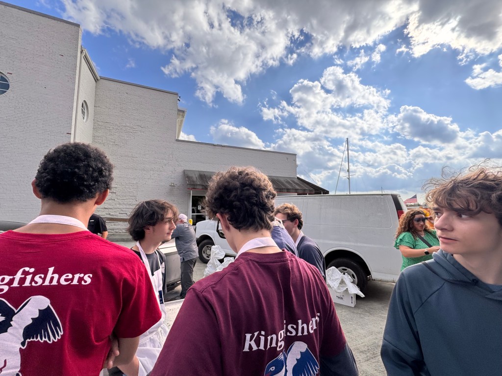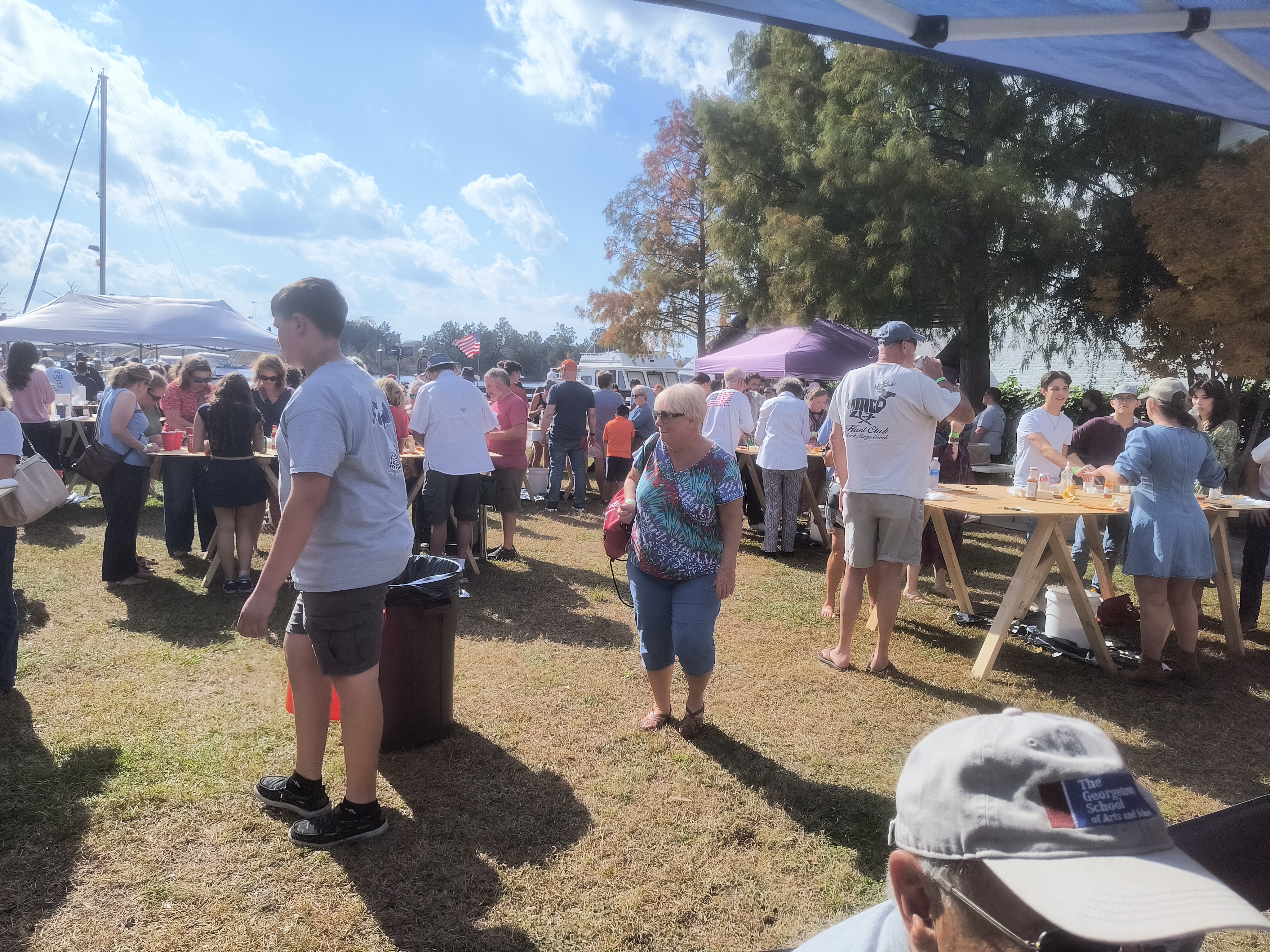 At the raffle table, parents were enjoying the sun and watching all the goings-on. Middle school students were busy handing out soft drinks, water, and bowls of hot pileau. A steady stream of people came in all afternoon, lured by the oysters and the convivial atmosphere.
