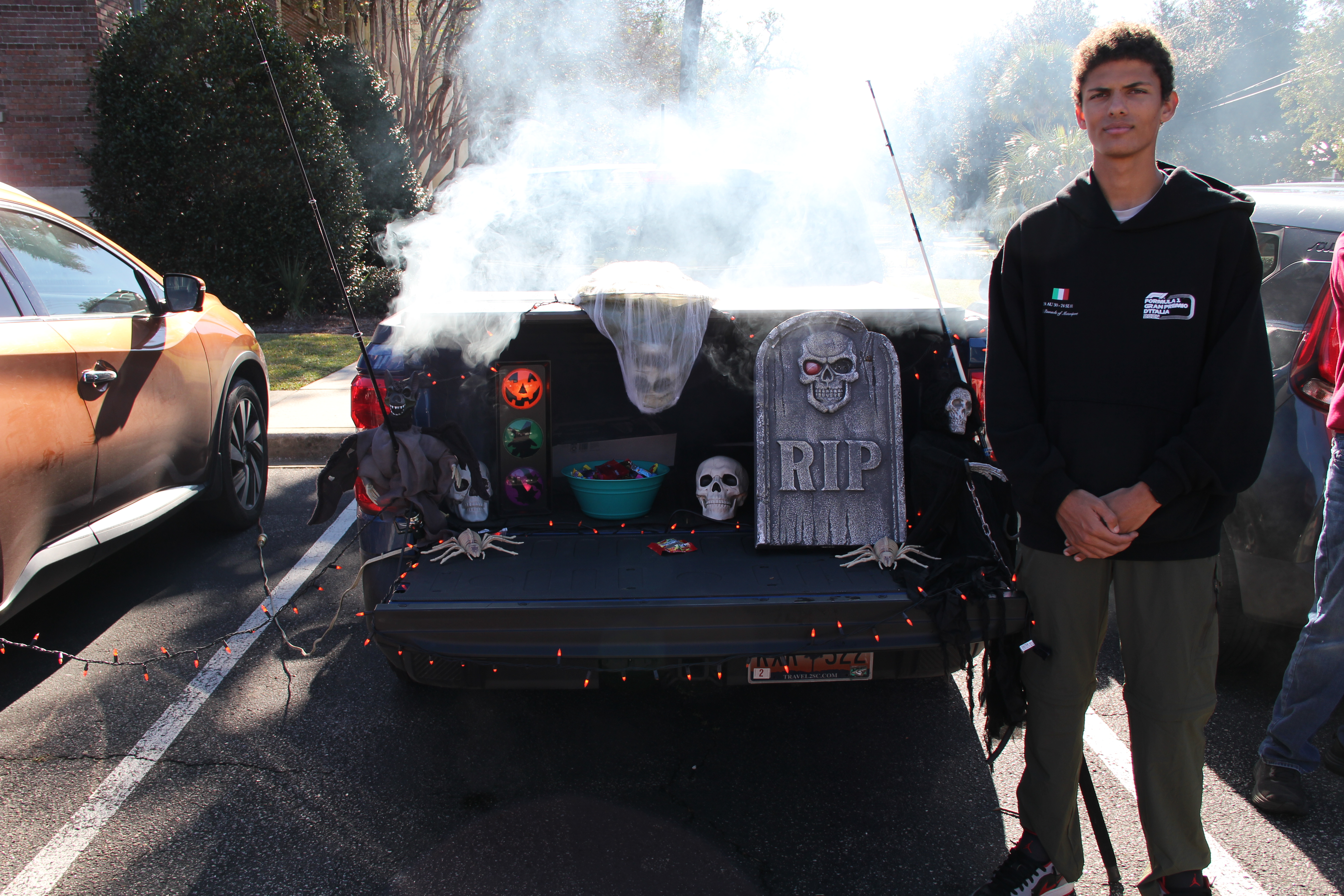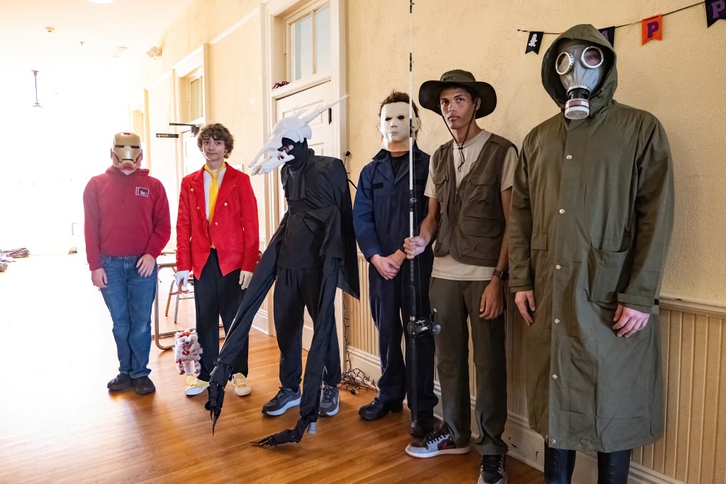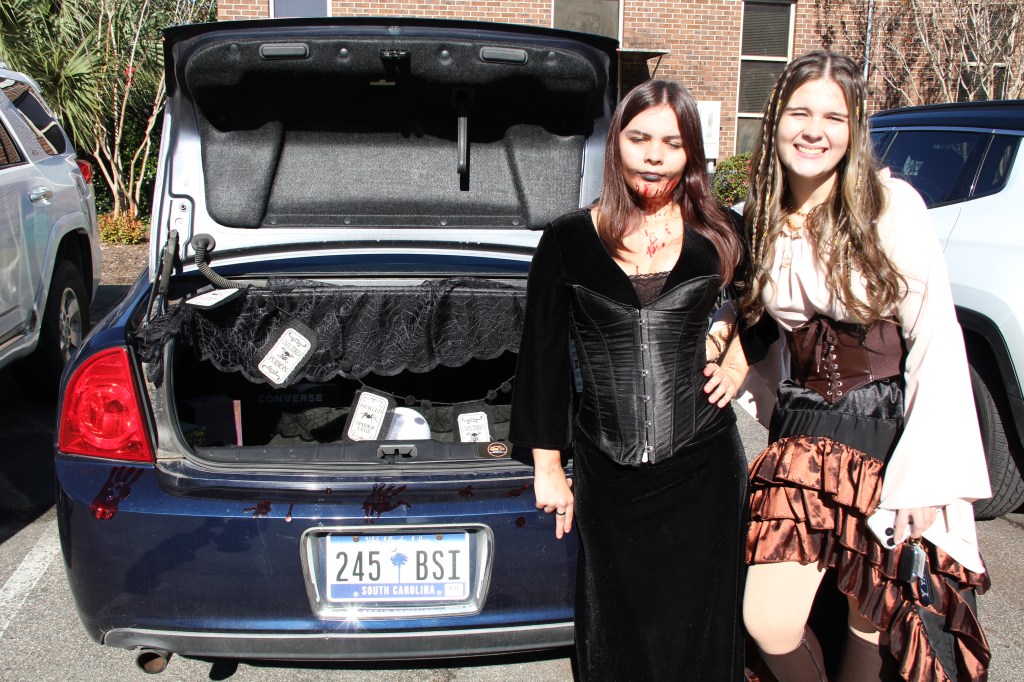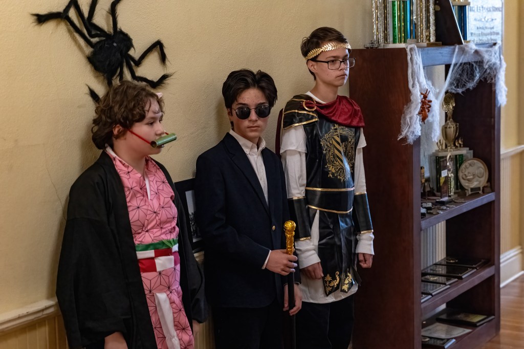 Halloween is fun at TGS because we get to come to school in costume. Student Council organizes a Trunk or Treat where the high-schoolers decorate their car trunks and pass out candy at break. This year there was even a smoke machine in the back of someone’s truck. A dinosaur, Anne Boleyn, Joan of Arc, a Roman emperor, a swamp creature, a pirate, the Godfather, a vampire, a referee, and several characters from YA fiction milled around the parking lot, collecting candy. At the end of lunch, there was a costume parade with prizes given for best costume. The Swamp Creature (Bryan) won handily for high school; Middle School gave the award to Anne Boleyn (Delaney).