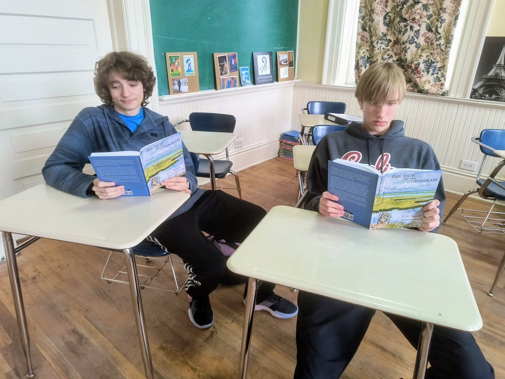 Mr. Smith shared some of his two books with us. One of his essays in A Pocket Wild is about Roosevelt Pickett, a Black man who worked for Oliver’s Lodge in Murrells Inlet ever since he was nine years old and who knew many things about the marsh. He was Mr. Smith’s neighbor and best friend. “Any person who ever met Roosevelt would never forget him,” he told us. He also read some excerpts from The Tide in the Cordgrass, an animal story set on the marsh in Murrells Inlet. There is a character called Clarence the Kingfisher, King of the Creek, and Mr. Smith was delighted to learn that the Kingfisher is our mascot.