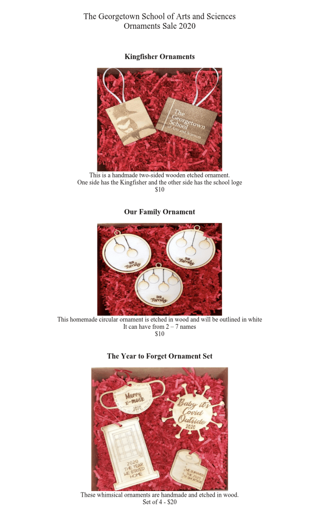 The Kingfisher Crew has put together a “fun”-raiser to buoy all our spirits during this Covid – Holiday Season. These handmade tree ornaments will be here in time for the holidays if you order now online or by downloading the form and sending/bringing it into the school office.