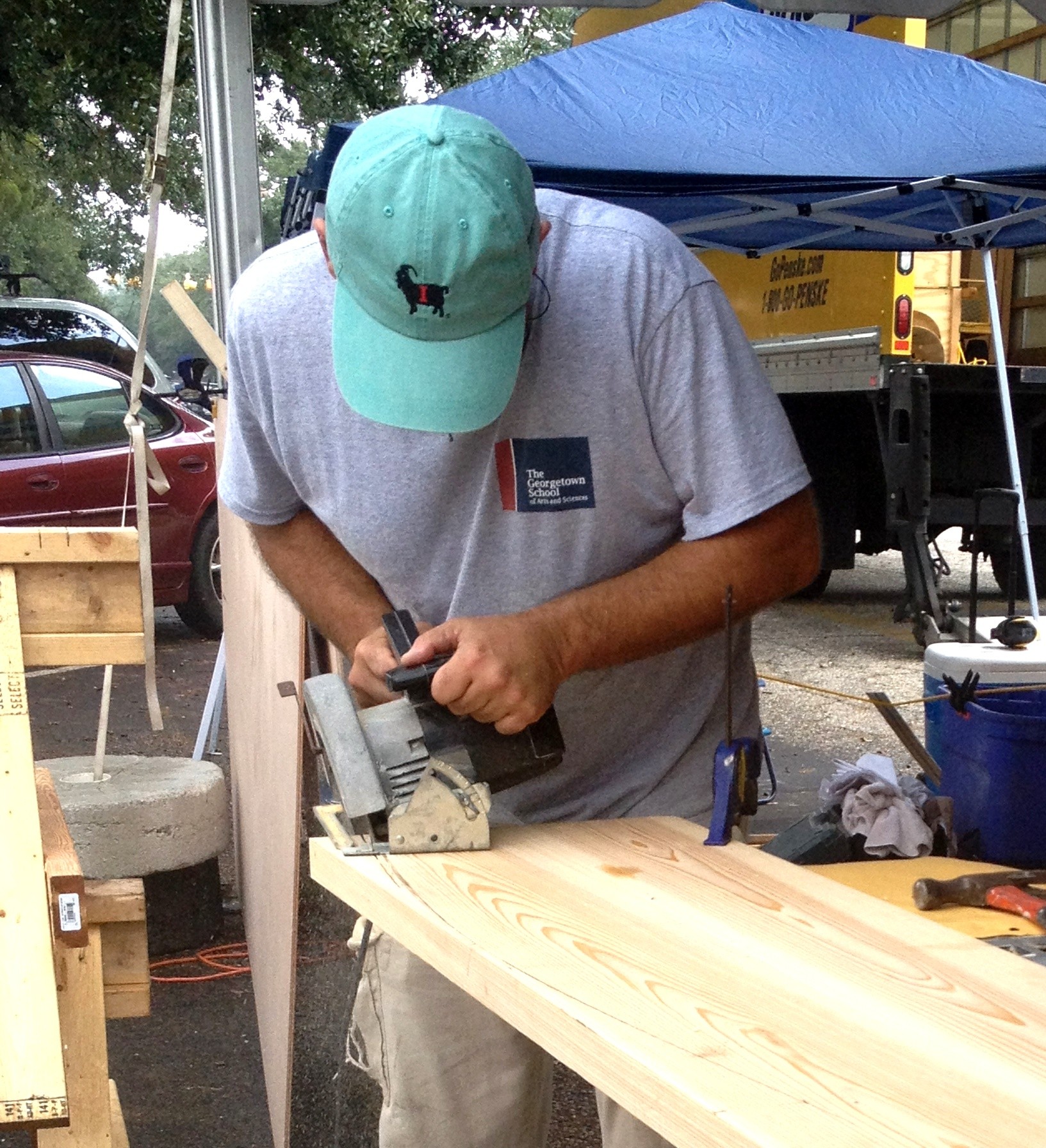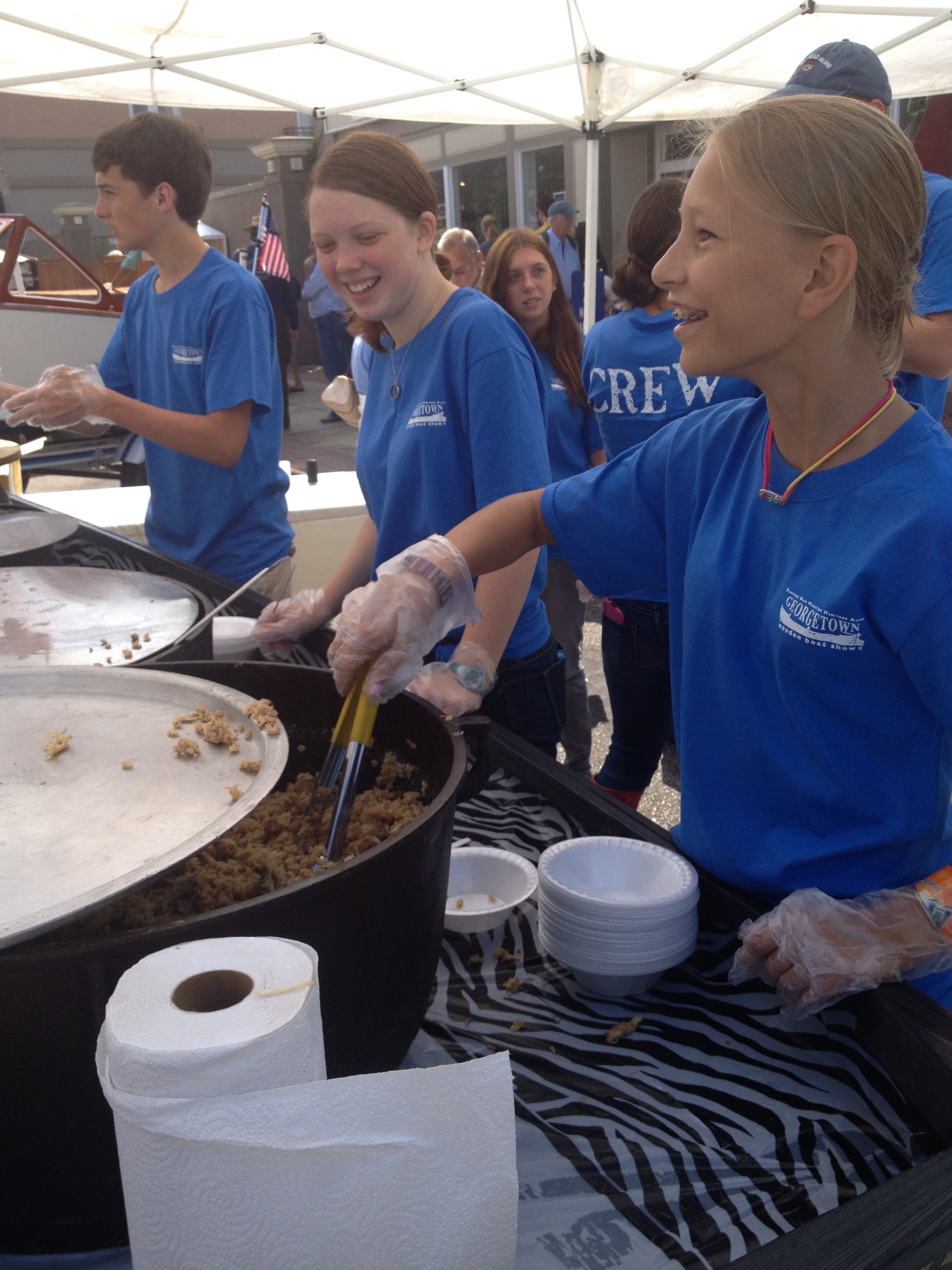 Members of the TGS community volunteered at the 2013 Wooden Boat Show, an event which had spectacular success this year. Head of School Dr. Gary Gates once again joined in the boat-building challenge with his partner Sean Hoelscher of Myrtle Beach. With sawdust flying, sweat dripping and power tools whining, the two shaved fifty minutes off their last-year’s time and placed fourth overall in time. Sally Swineford, owner of The River Room and long-time organizer for the Wooden Boat Show, asked our students to take responsibility for one of the food tents. So Kingfishers were dishing up pilau and passing out soft drinks and water for most of the day. We also helped out Dr. Ged Tiller with the sailing demonstration for the S. C. Maritime Museum, chief beneficiary of the Wooden Boat Show. Good job all around!