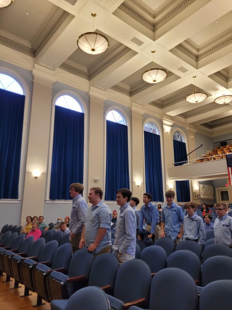 Finally, the big moment arrived–the presentation of the six TGS awards. Teachers came forward to give them. The winners are as follows: Isaac Shumard (Academic), Ella Cheek (Art), Annika Villafranca (Kingfisher), T. J. Ulrichsen (Senior Speech), Jack Small (Service), and Morgan Edwards (Sportsmanship/Extracurricular). These six outstanding students stood at the front of the Auditorium beaming and enjoyed their well-deserved moment.
